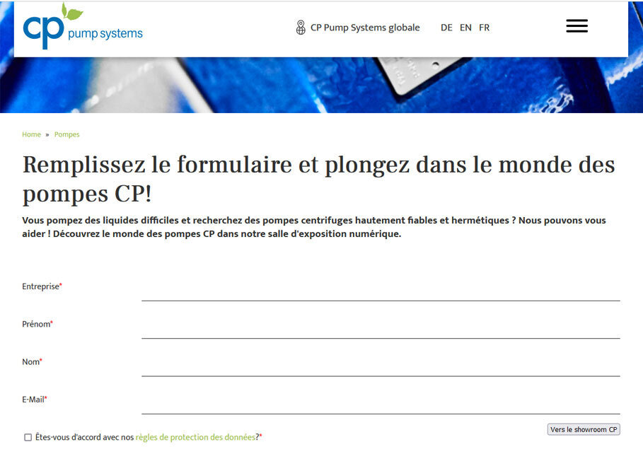 Vous êtes curieux ? Alors plongez dans l'univers des pompes CP ! Il vous suffit de remplir le formulaire et d'ouvrir l'accès à la salle d'exposition digitale de CP. Nous nous réjouissons de votre visite !